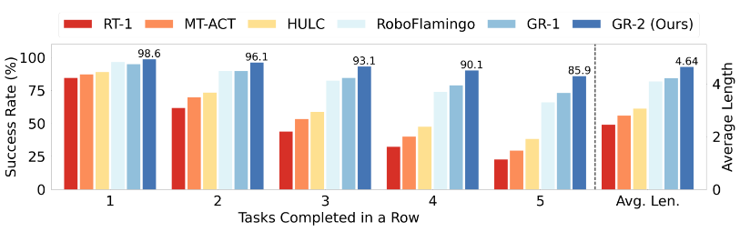 CALVIN基准[21]:单任务成功率98.6%,5任务链成功率85.9%(SOTA,较GR-1提升12.8%) [Fig. 10]。