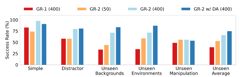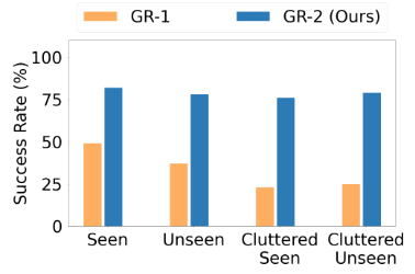 多任务学习:平均成功率97.7%(Simple),在Unseen Environments达87.0%(较GR-1[5]提升24.3%)[Fig. 6]。